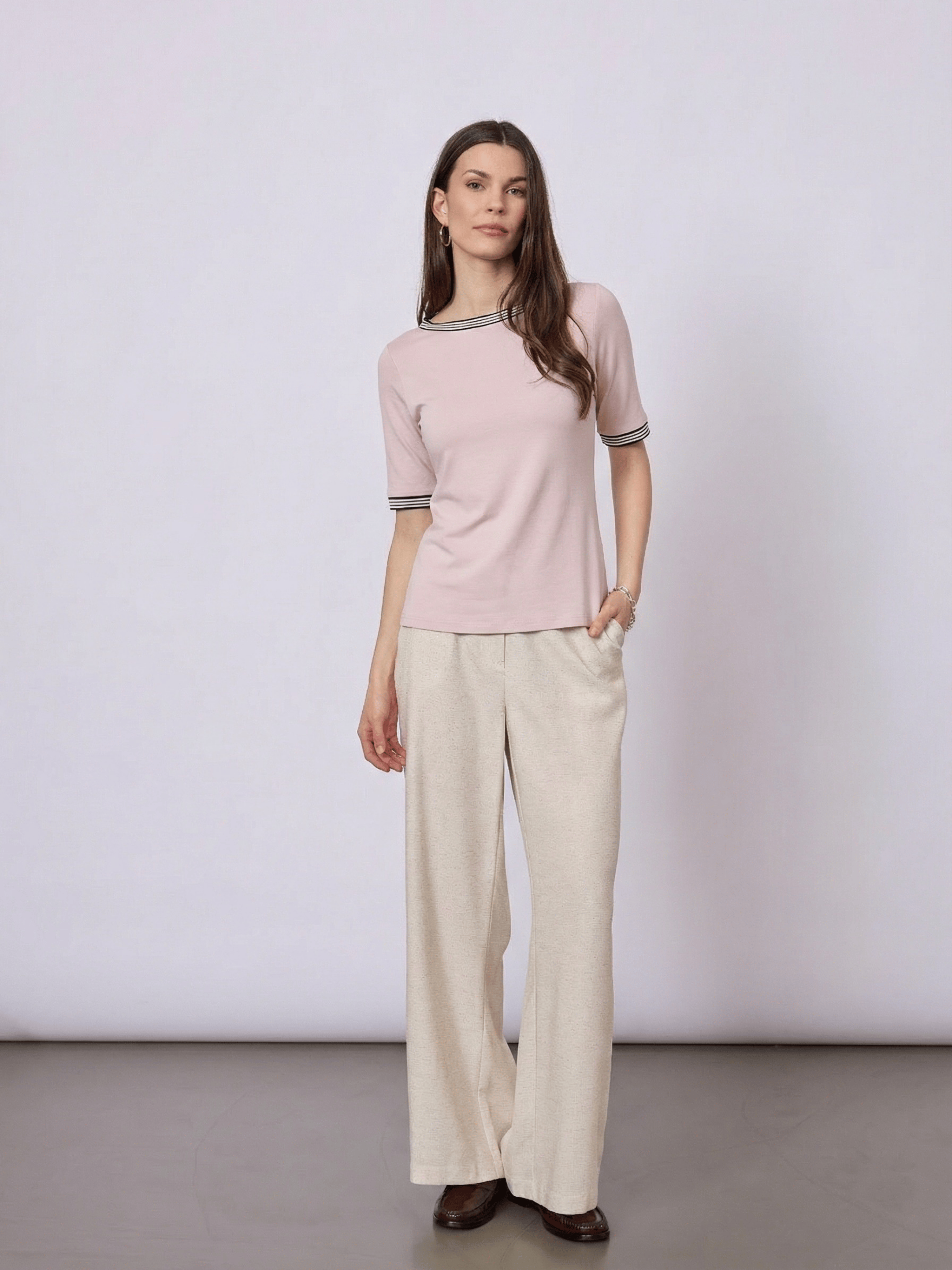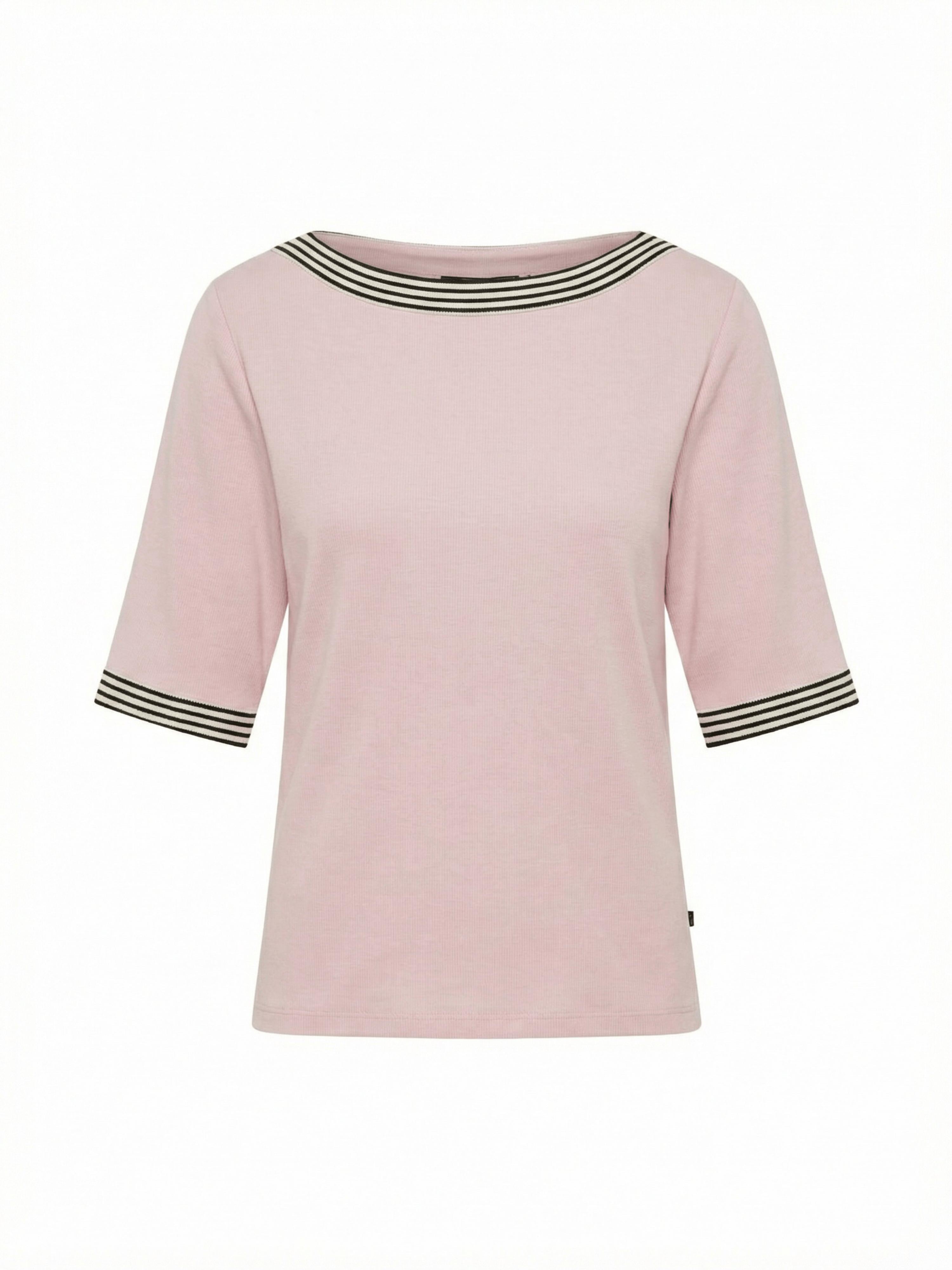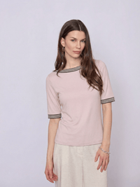 Elegant og komfortabel T-shirt med fine kontrastdetaljer, fremstillet i en blød og strækbar kvalitet. En alsidig T-shirt, der fungerer både til hverdag og mere pæne anledninger.