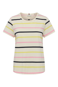 T-shirt i blød økologisk bomuld med klassisk rund hals og korte ærmer. Chris har striber i friske farver og en lille slids bagpå, som giver et diskret twist til et enkelt design. En let og behagelig hverdagsfavorit.