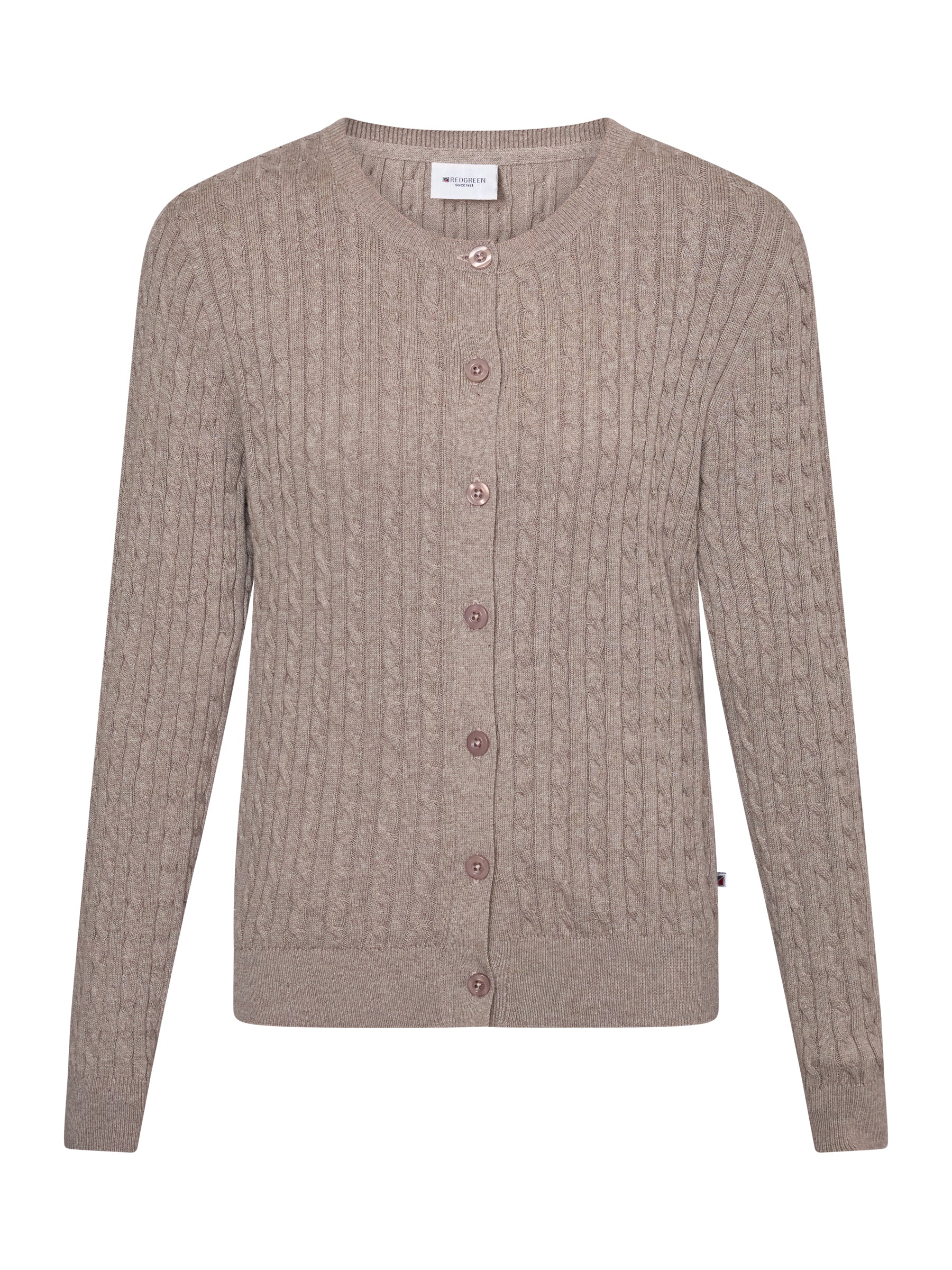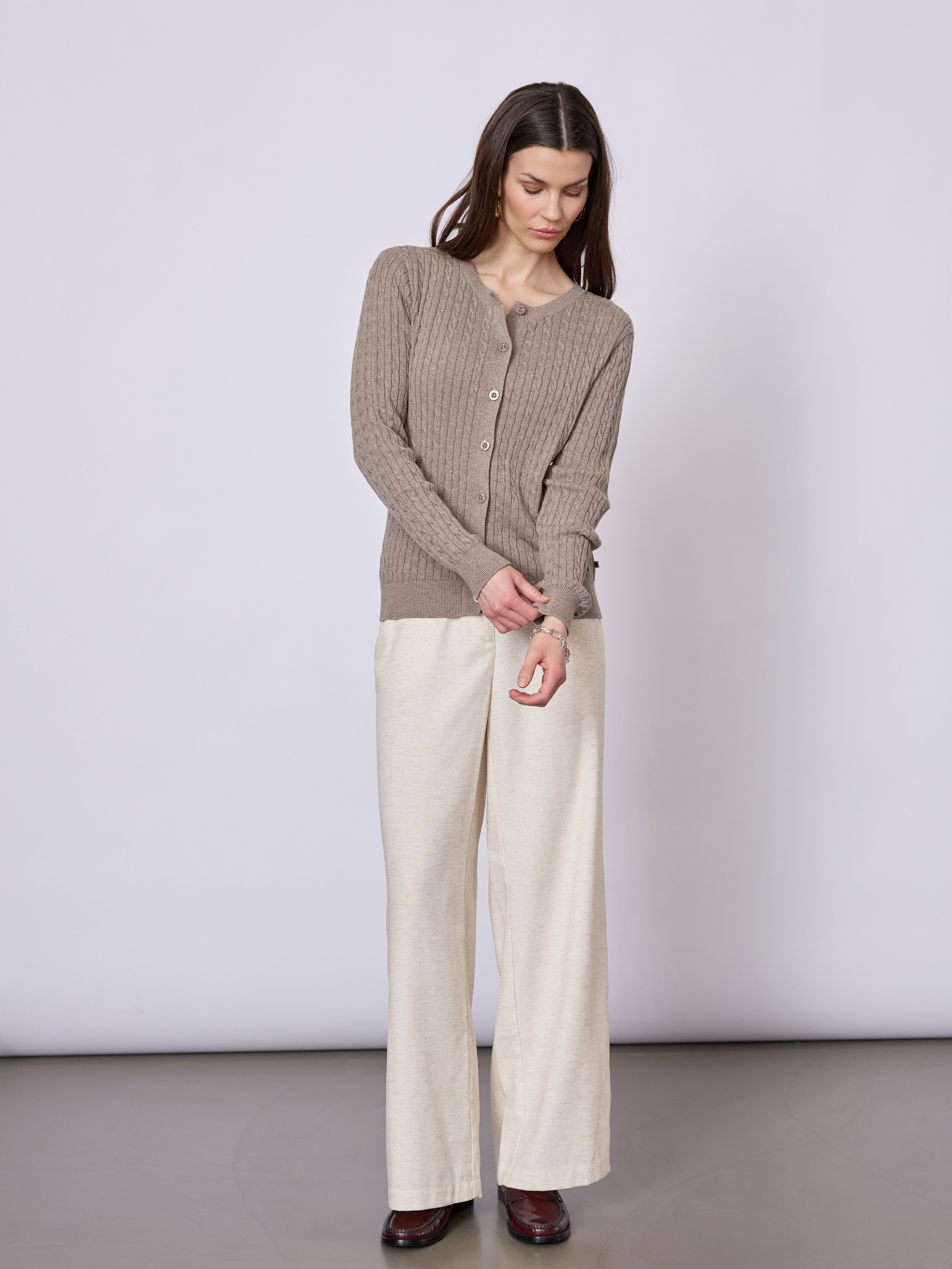 Klassisk strikket cardigan i 100% økologisk bomuld med et tidløst kabelstriksmønster og et feminint udtryk. Cardiganen har lange ærmer, knaplukning foran og en rund halsudskæring, der gør den nem at style både til hverdag og arbejde.