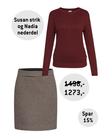 Et klassisk sæt med kabelstrik i blød kvalitet og en nederdel i tidløst hundetandsmønster. En kombination af komfort og elegance – perfekt til både hverdag og mere stilfulde øjeblikke.