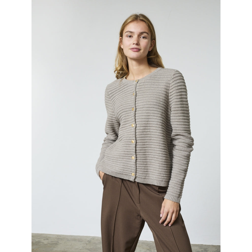 Denne cardigan kombinerer et tidløst design med fine detaljer. Den strikkede struktur giver et levende udtryk, mens de gyldne knapper foran tilfører et diskret maritimt præg. Med sin klassiske pasform og bløde kvalitet er den en alsidig style, der fungerer både over en skjorte til arbejde og som et let lag til hverdagen.
