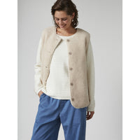 En praktisk og alsidig vest med to udtryk i ét. Den bløde teddy-side giver et hyggeligt look, mens den quiltede side trækker stilen i en mere klassisk retning. Et godt lag til skiftende temperaturer – både ude og inde.