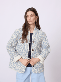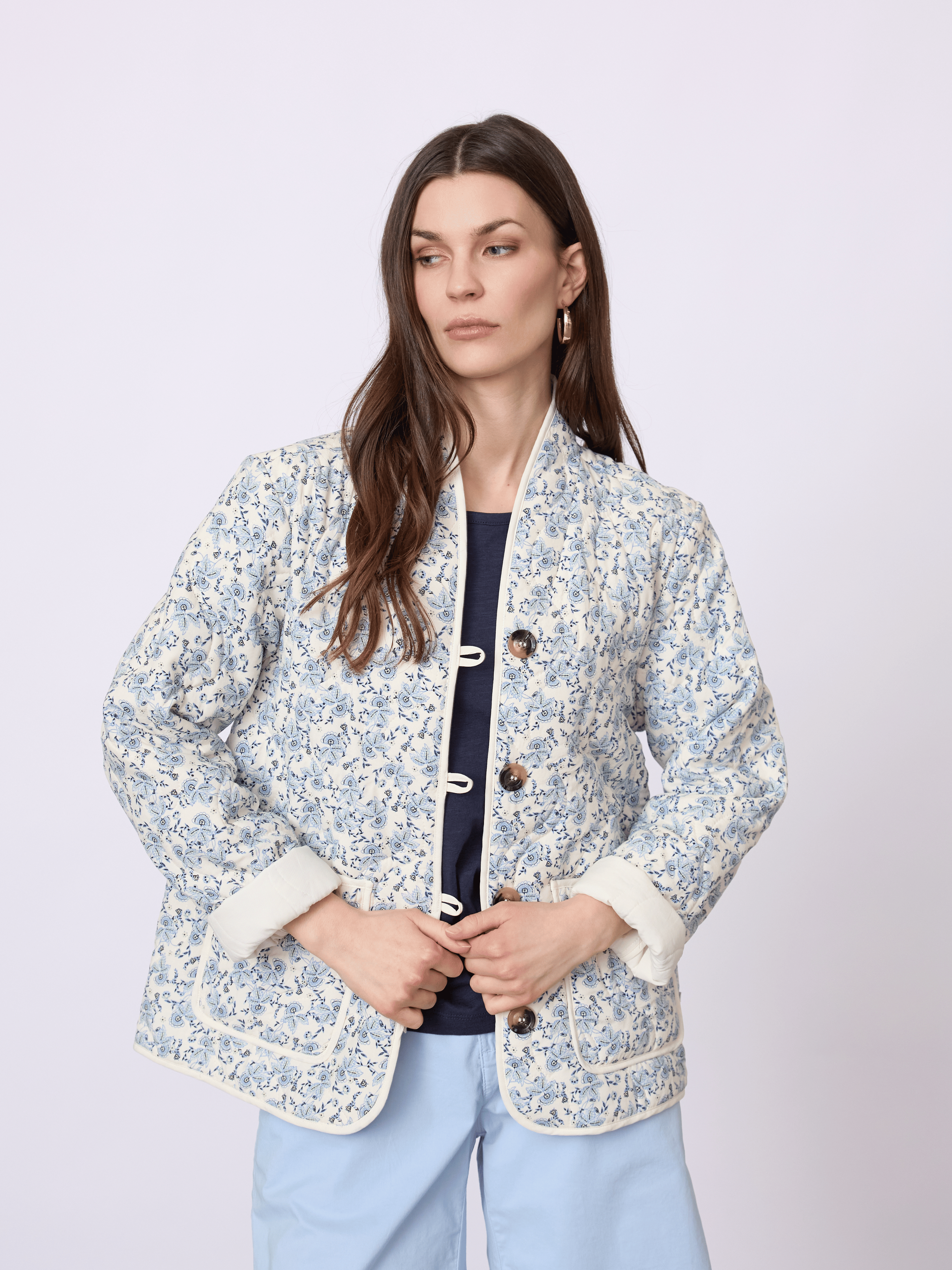 Leichte und feminine Damenjacke aus 100 % Viskose mit dekorativem Allover-Print und weichem, lässigem Schnitt. Eine bequeme Jacke, die sich ideal als leichte Schicht in der Übergangszeit eignet.