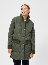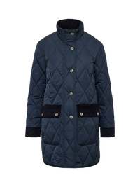 Bliv stilfuld med denne quiltede jakke, der har elegante fløjlsdetaljer ved lommer, ærmer og krave. De diskrete slidser med knaplukning i siderne giver ekstra komfort og bevægelsesfrihed.